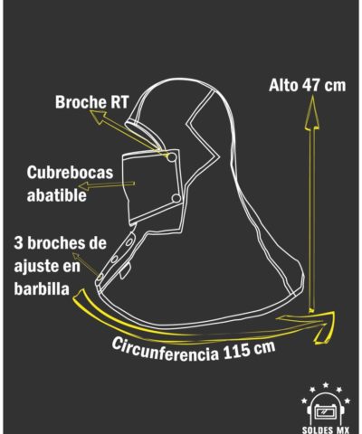 Diseño funcional:* Equipada con 7 broches RT para un ajuste seguro y cómodo, asegurando que la capucha permanezca en su lugar durante el trabajo. Además, cuenta con un cubrebocas abatible que proporciona versatilidad y protección adicional cuando sea necesario.